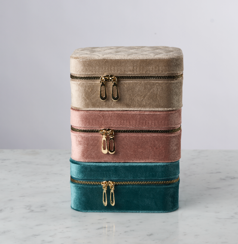 Elegante smykkeskrin i velour med plass til smykker i to etasjer.