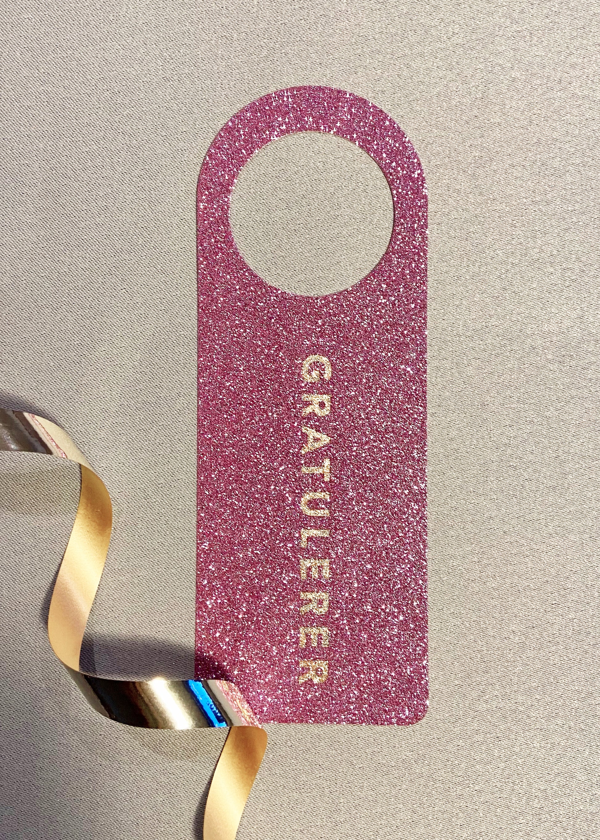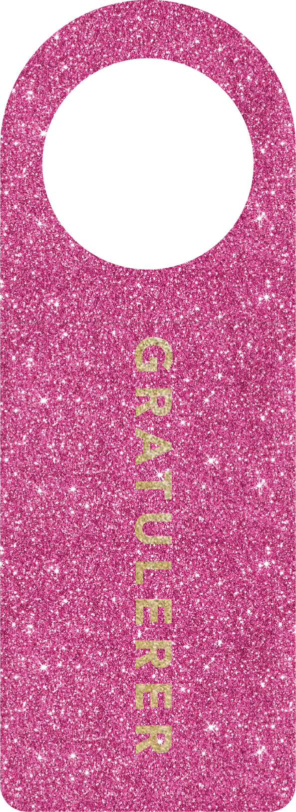 Kort til å henge på flaske, i rosa glitter farge med gulltekst.