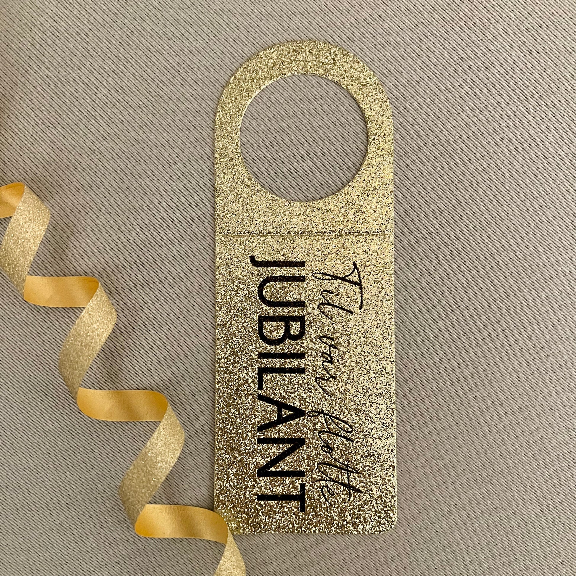 Kort til å henge på flaske, i gull glitter farge med sort tekst.