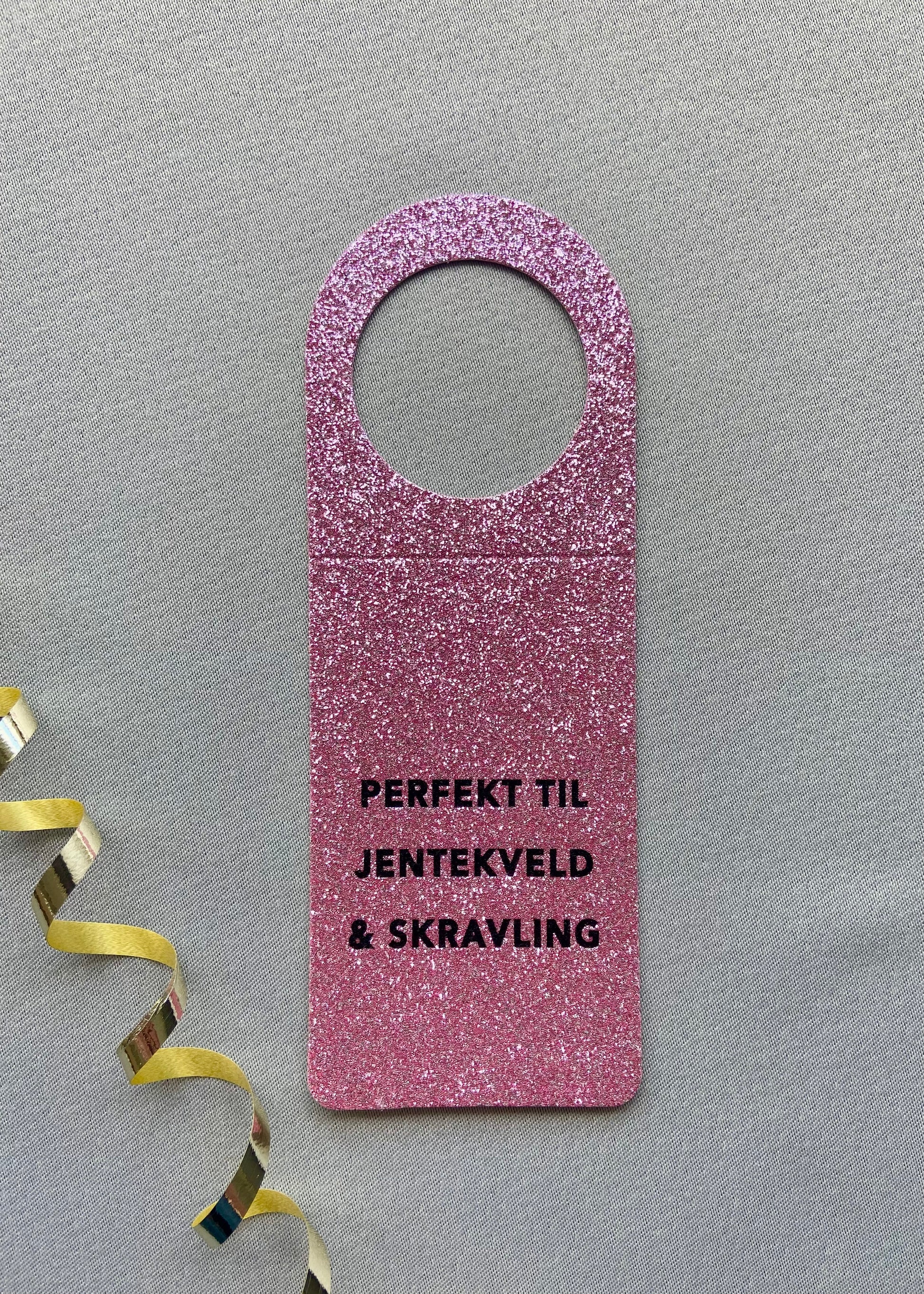 Kort til å henge på flaske, i rosa glitter farge med sort tekst.