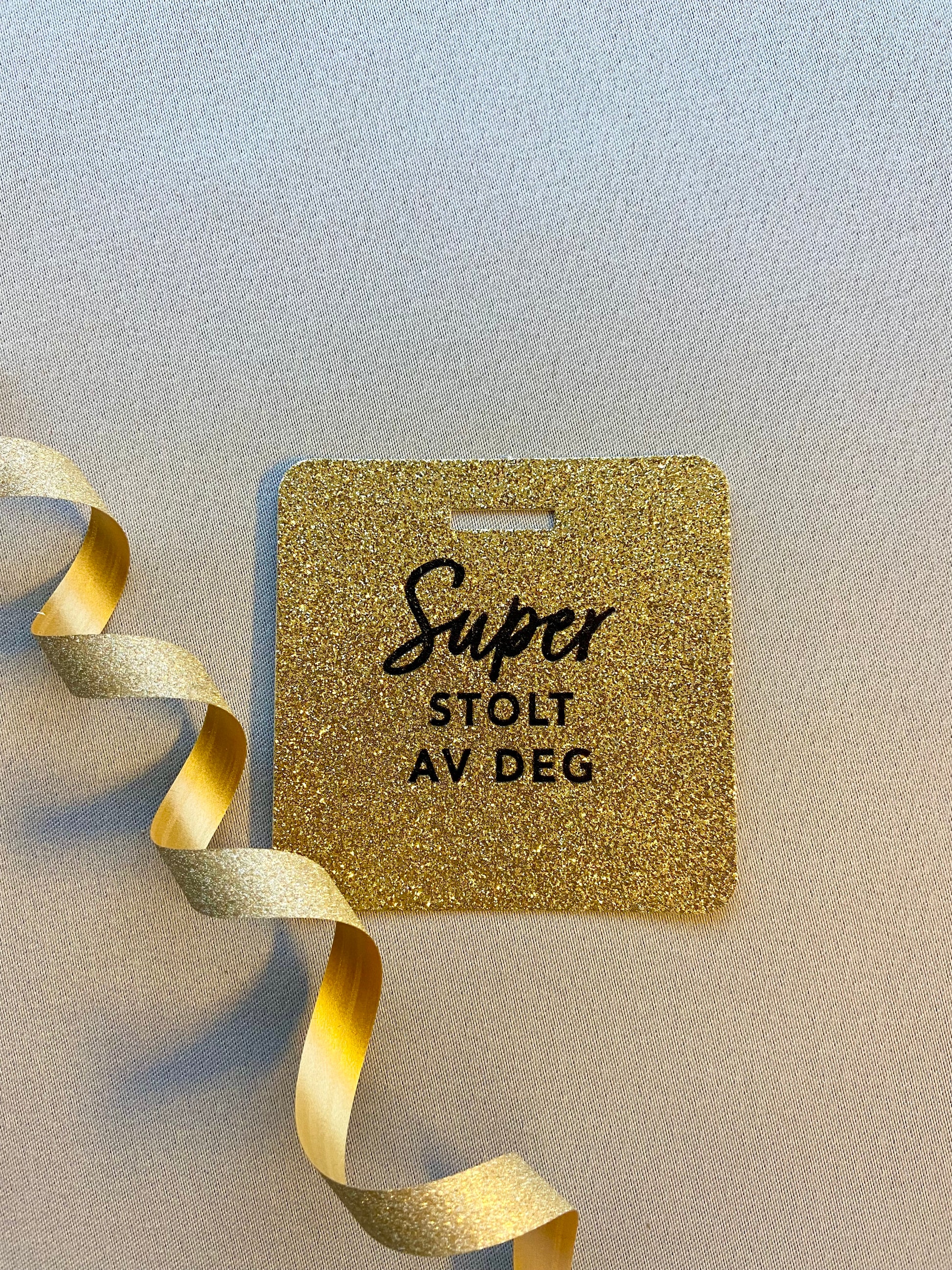 Kort til å henge på en pakke, i gull glitter farge med sort tekst.