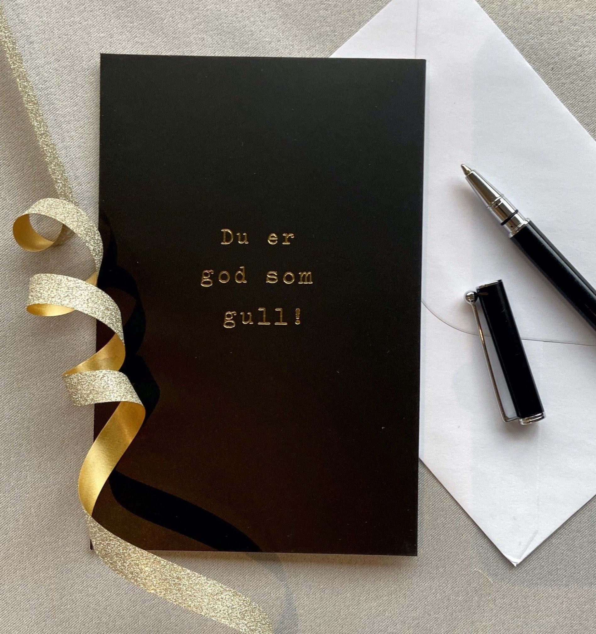 Dobbelt kort i sort farge med koselig tekst i gull.