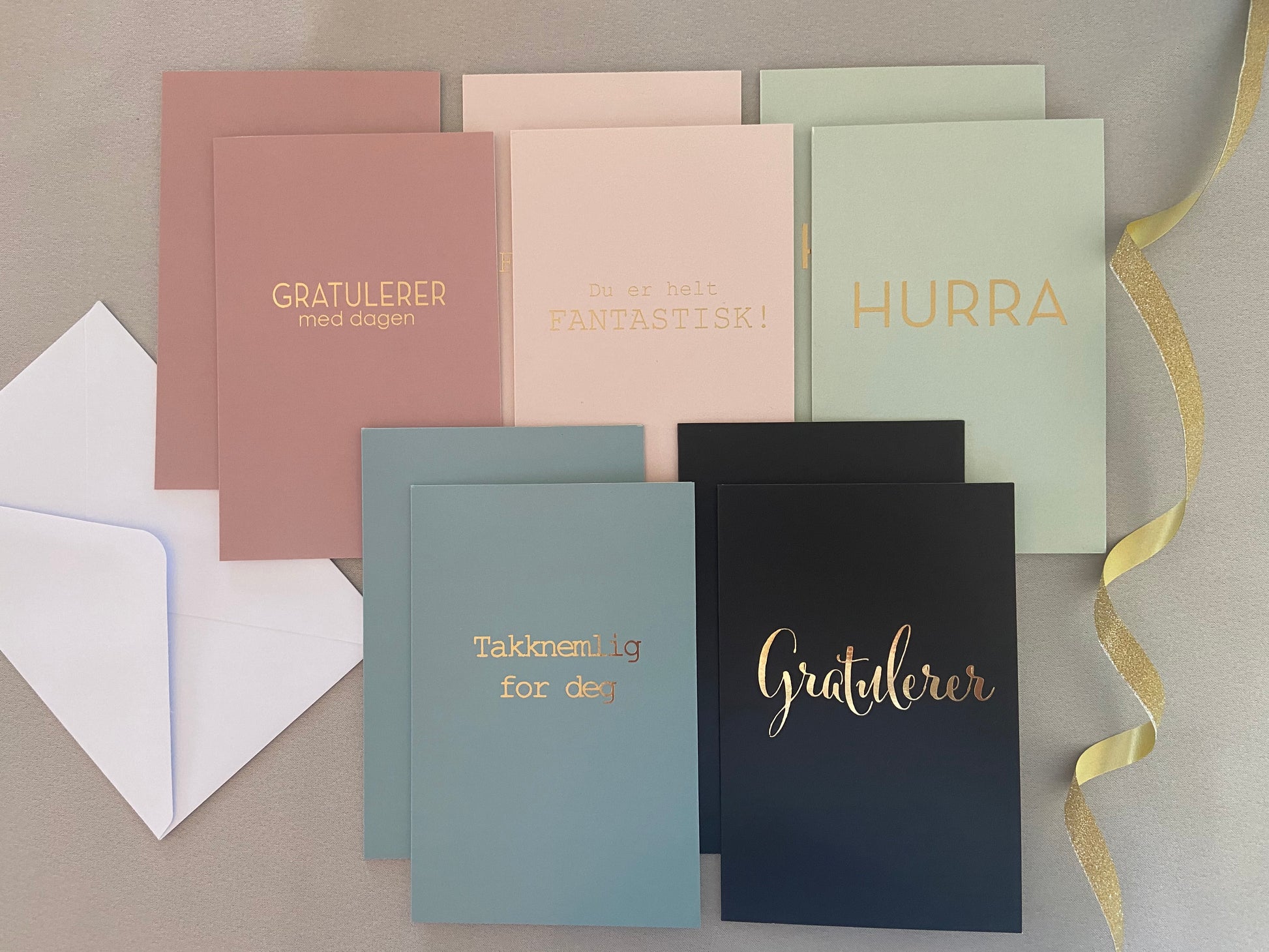 Det er 5 forskjellige design på kortene og tekst i gull.