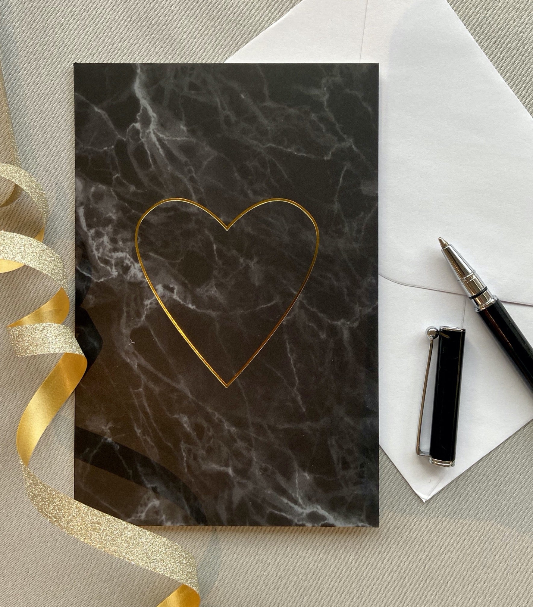 Dobbelt kort i sort marmor med trykk i gull.