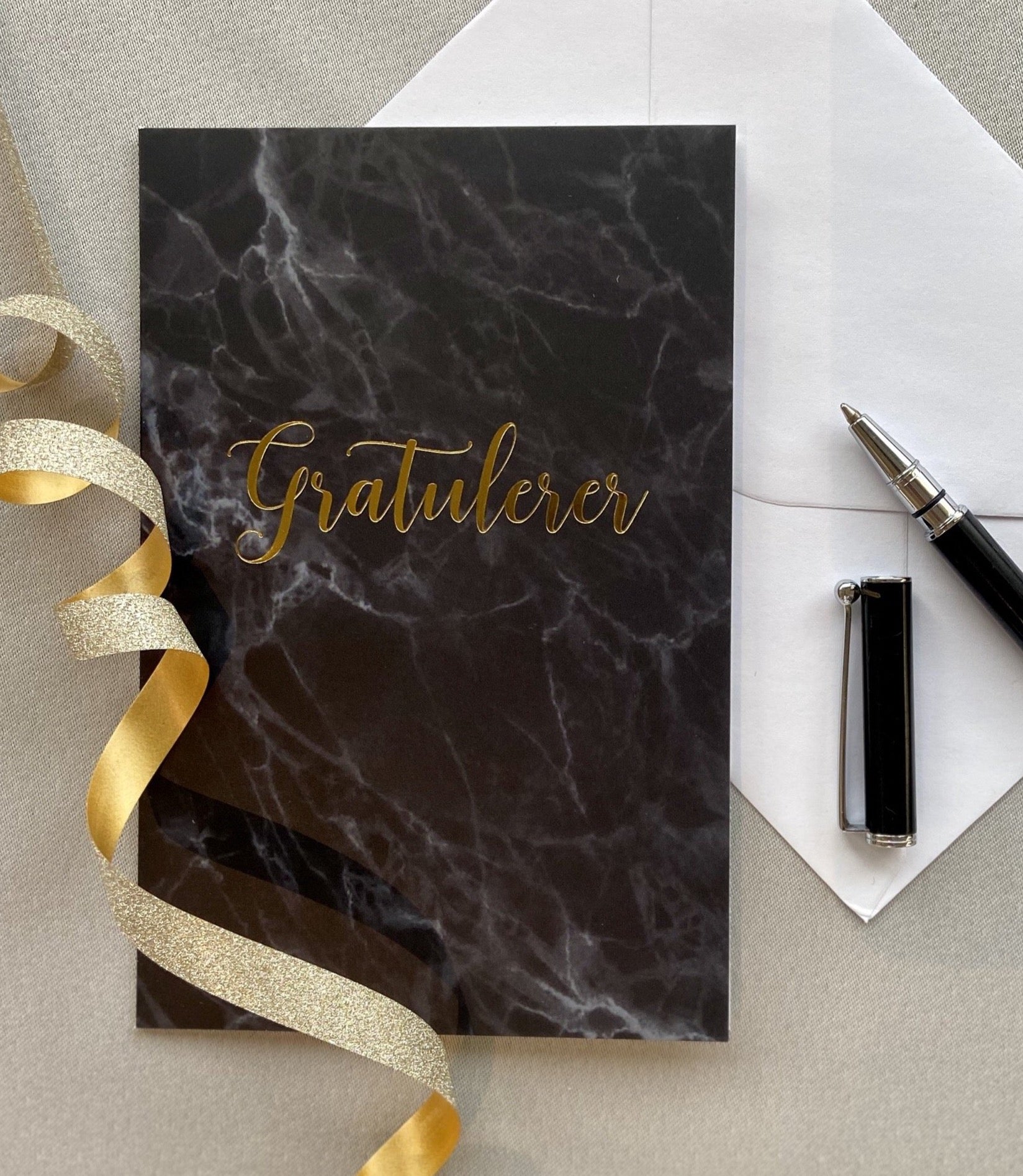 Dobbelt kort med sort marmortrykk og tekst i gull.