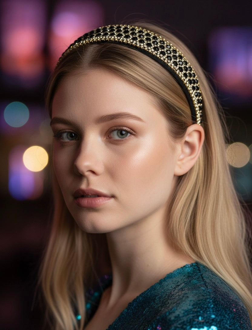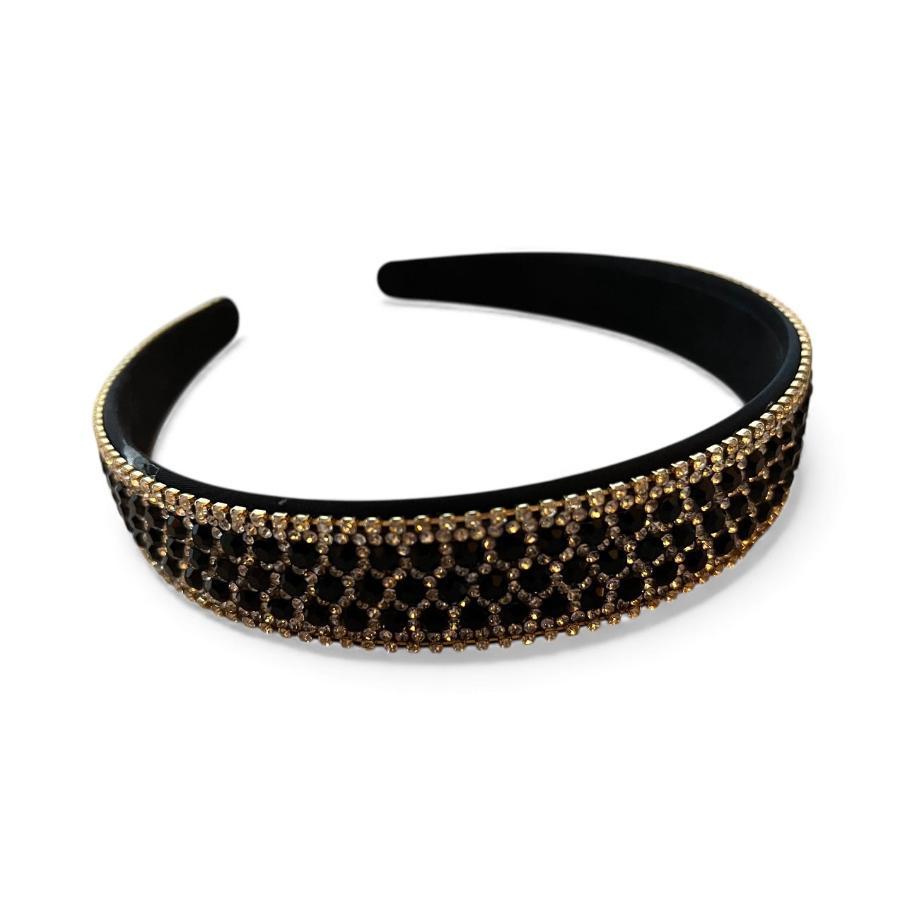 Denne lekre hårbøylen i sort glitter med gulldetaljer er prikken over i-en på ethvert antrekk.