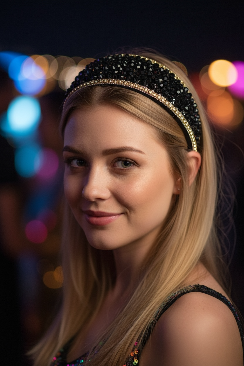 Denne lekre hårbøylen i sort glitter med gulldetaljer er prikken over i-en på ethvert antrekk.