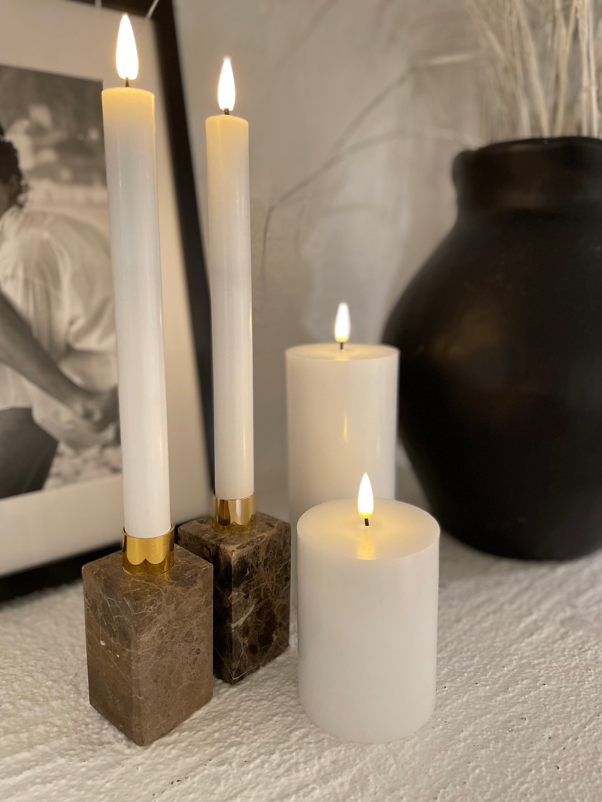 Våre LED-kubbelys er laget av voks med en "levende" 3D flamme som blafrer.