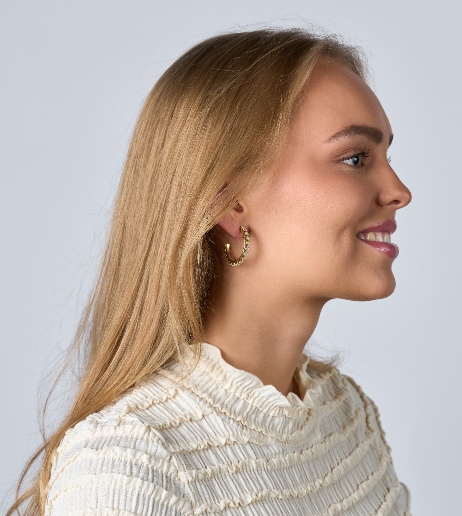 Lekre øredobber laget i rustfritt stål med 18K gull og PVD-coating, som gjør metallet vannbestandig og ekstra slitesterkt.