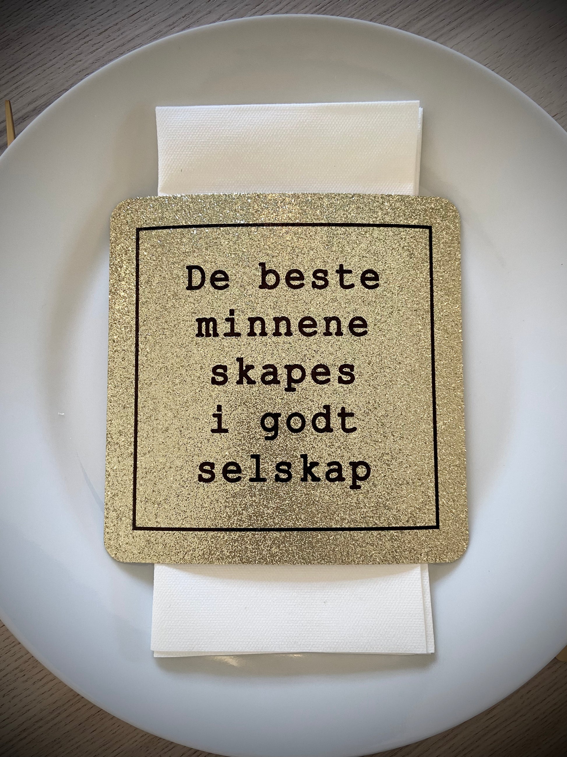 Pappiett gull glitter "De beste minnene skapes i godt selskap"