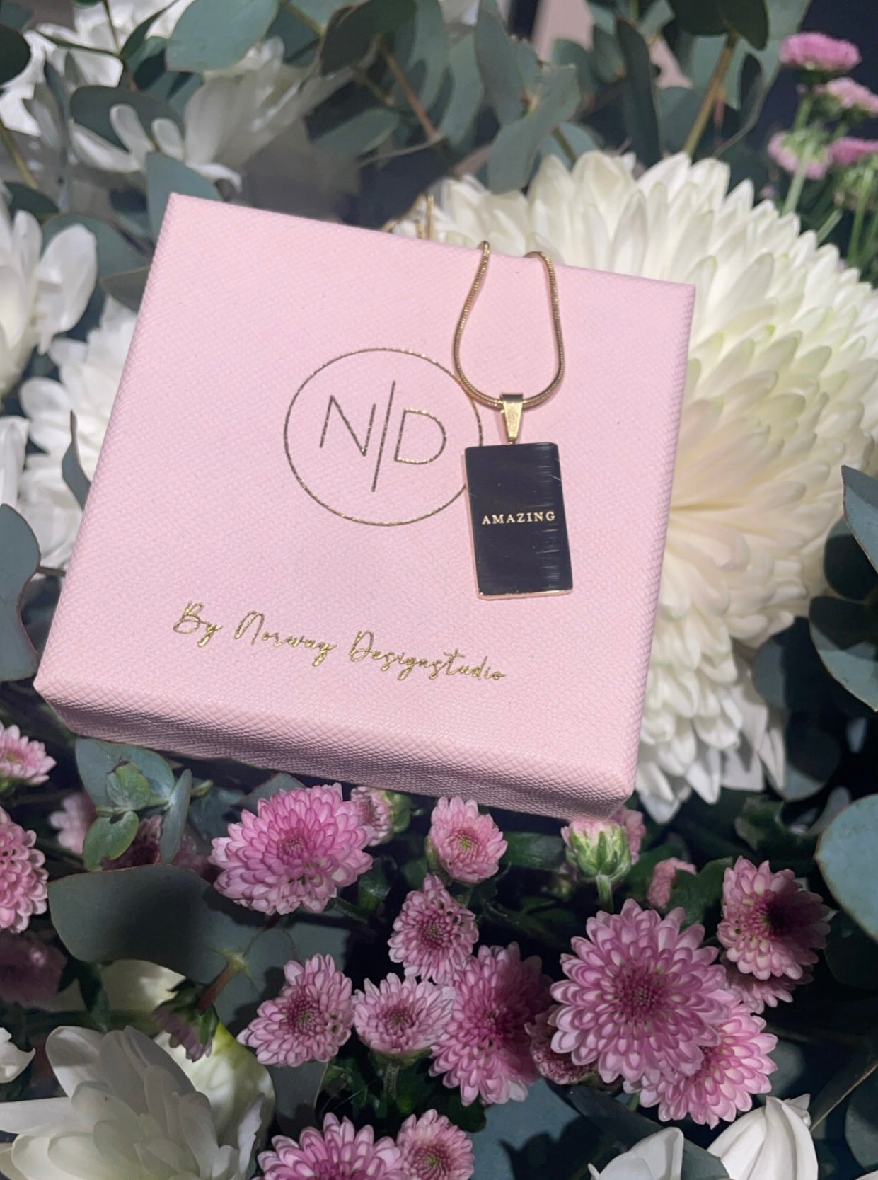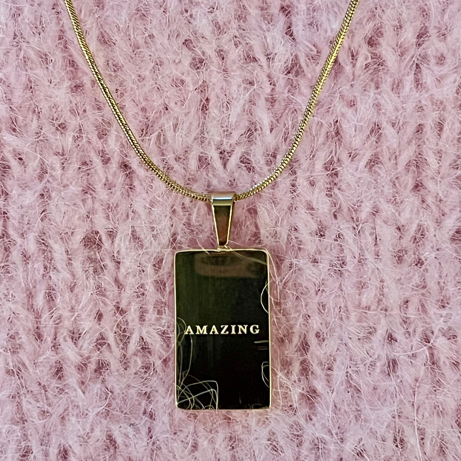 Våre tekst-smykker er laget i stål og belagt med 18 karat gull.