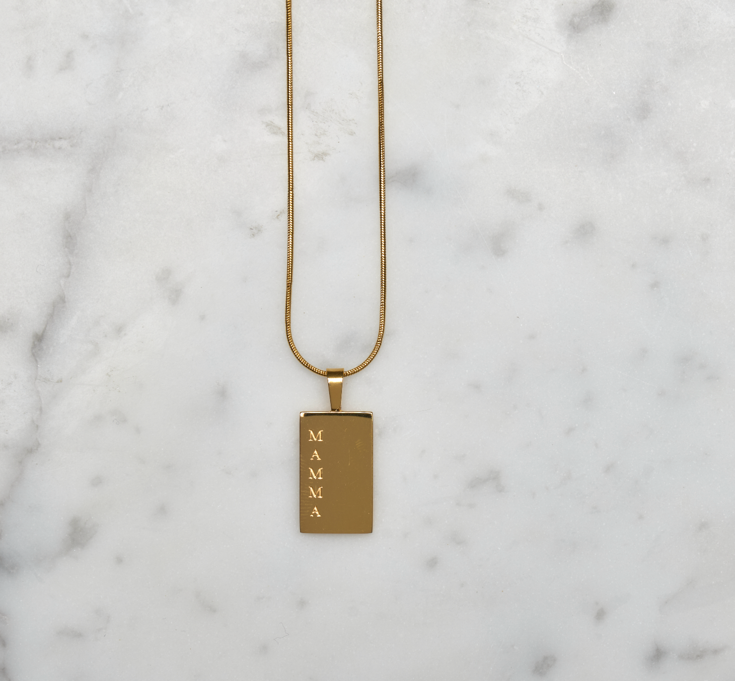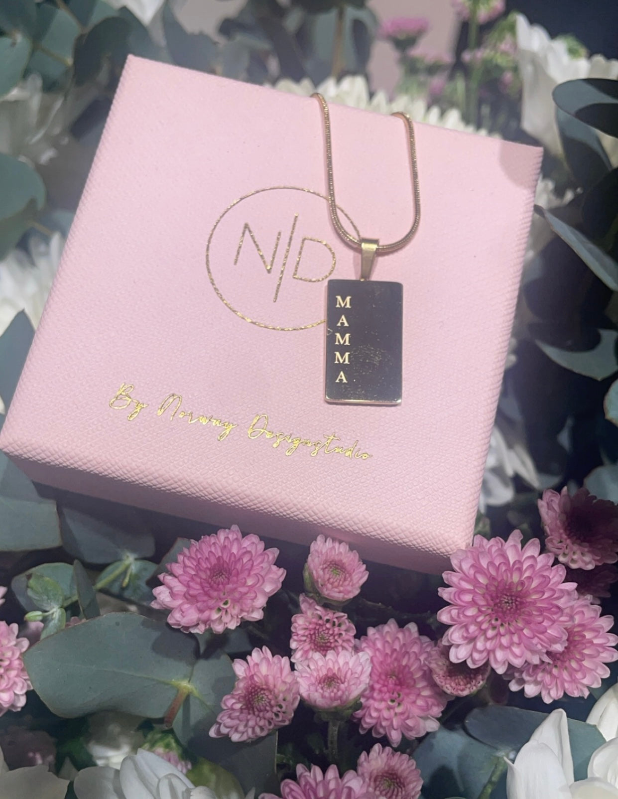Våre tekst-smykker er laget i stål og belagt med 18 karat gull.